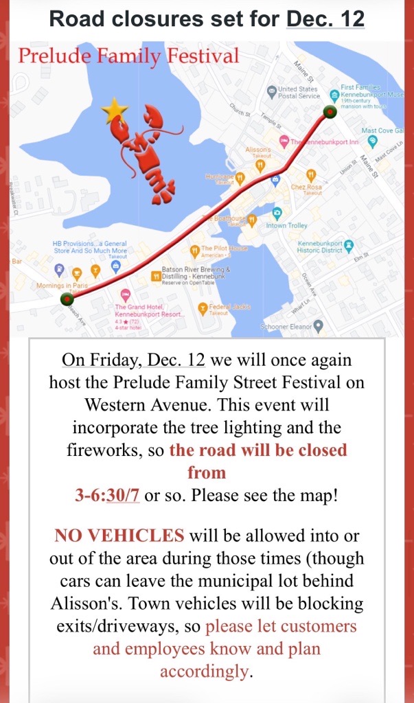 Saturday, Dec. 13: 8am-2pm, FREE CAPE PORPOISE SHUTTLE between the North Street parking lot, Kennebunkport Consolidated School, American Legion, and Cape Porpoise. 4-6pm, FREE SHUTTLE fro Village Marketplace to Mother’s Beach for the KBIA Lighthouse lighting.
